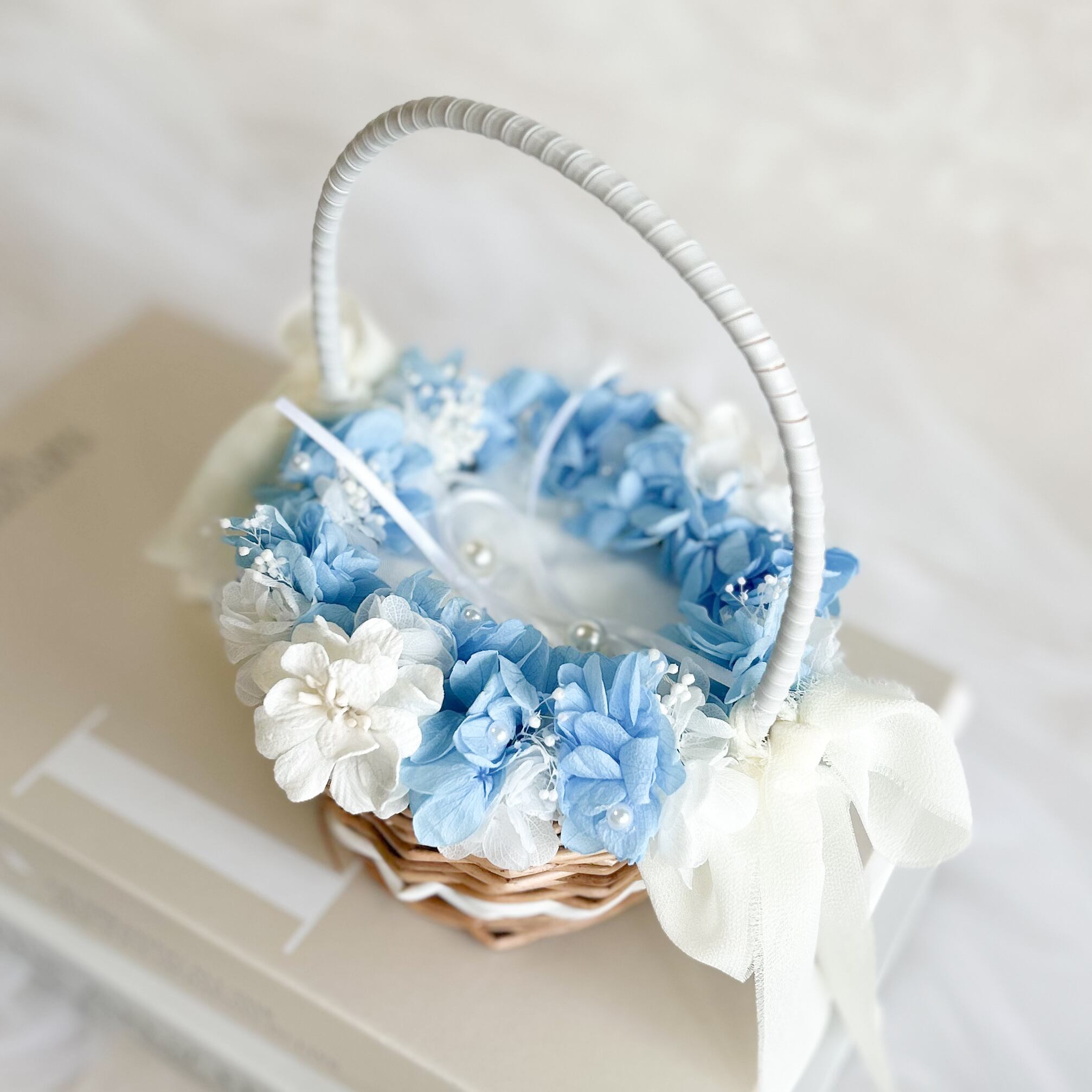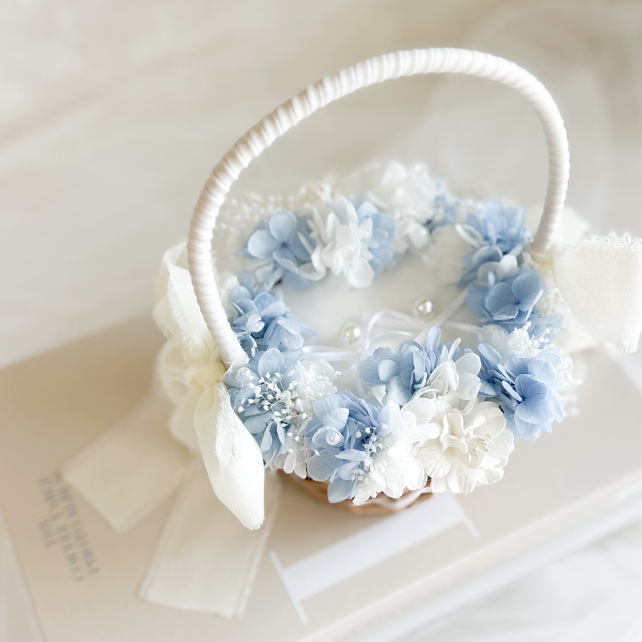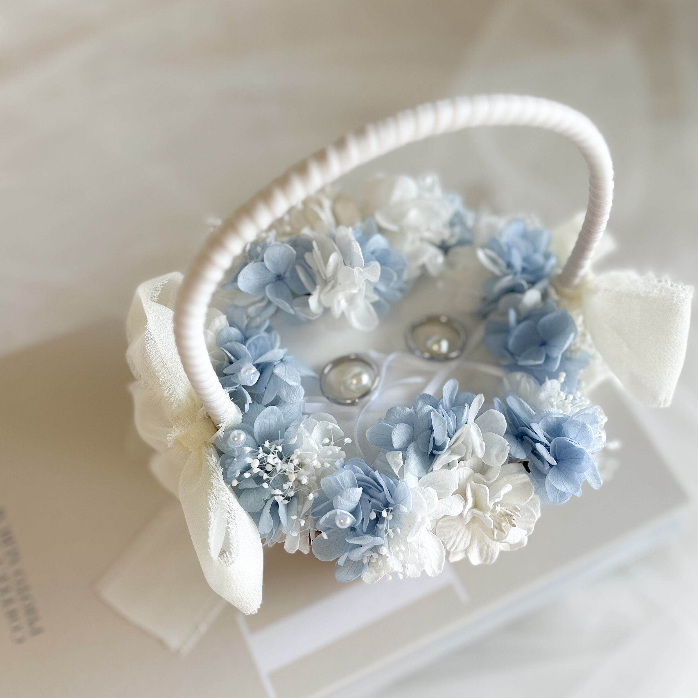 紫陽花と霞草を添えてパールをちらしたリングピローかご。