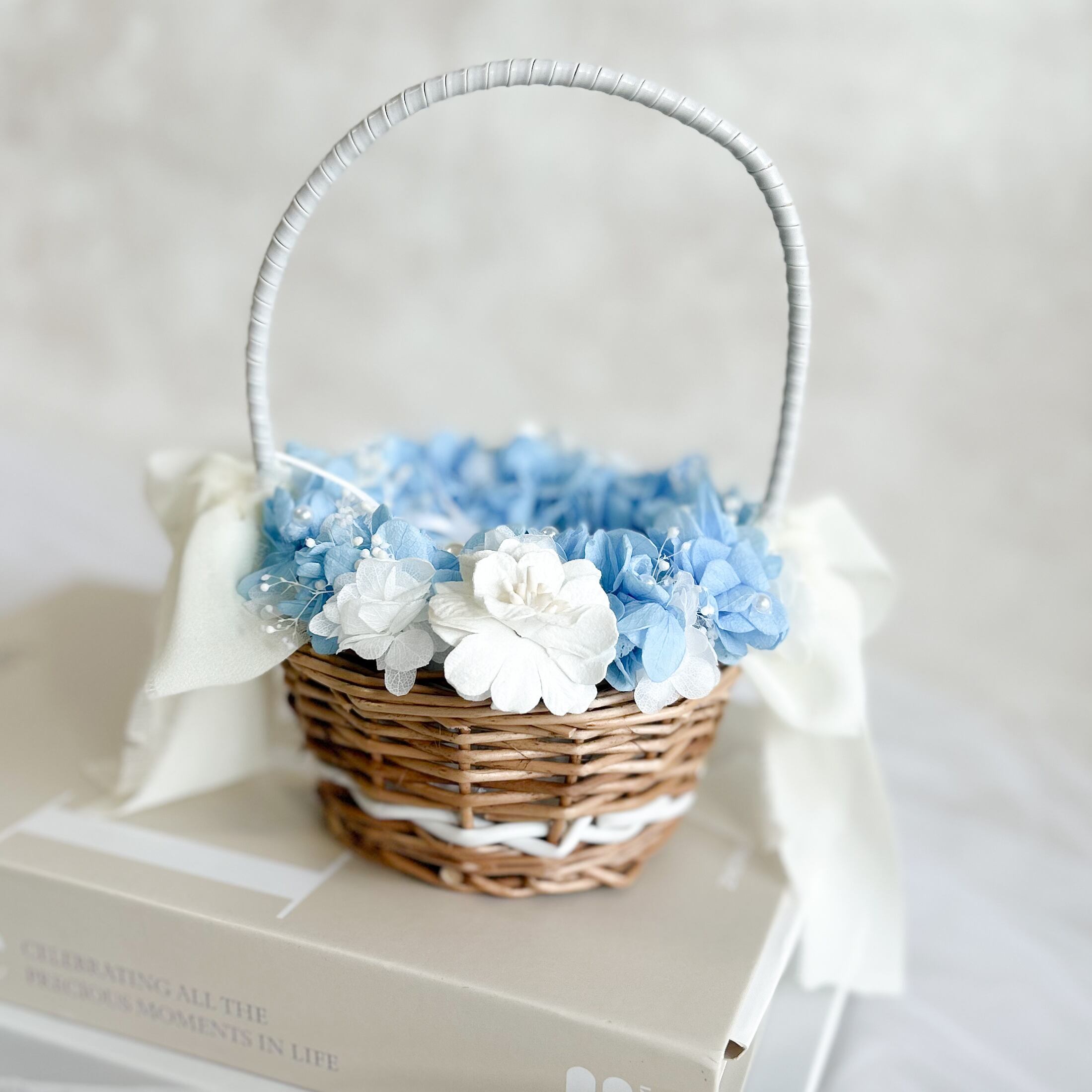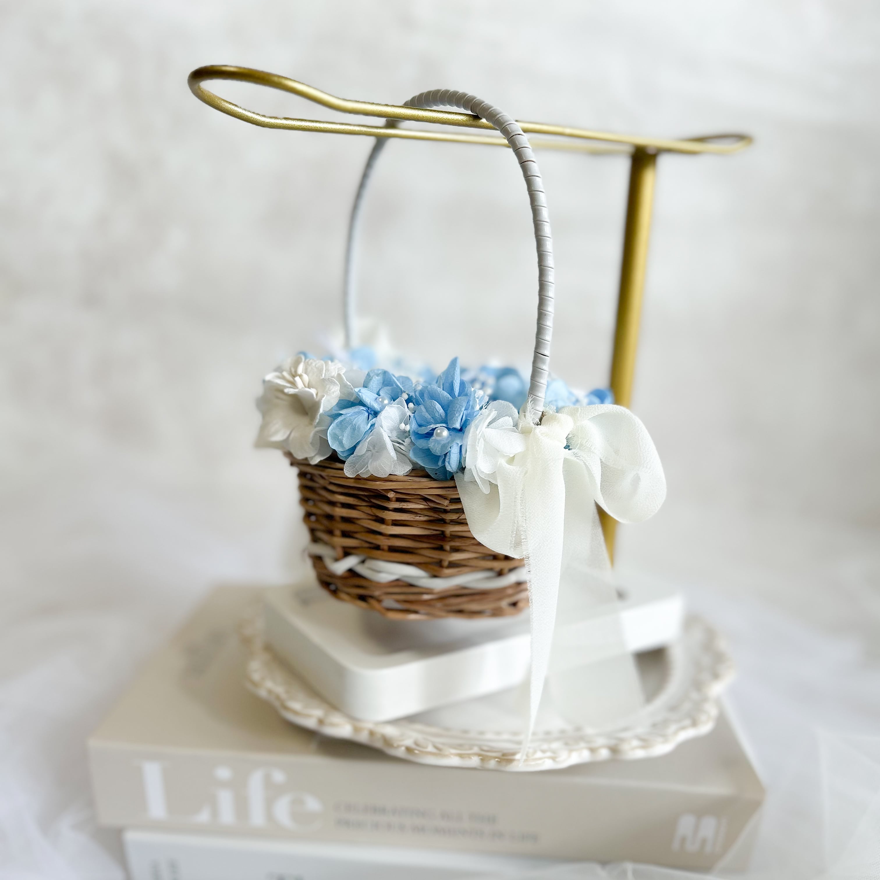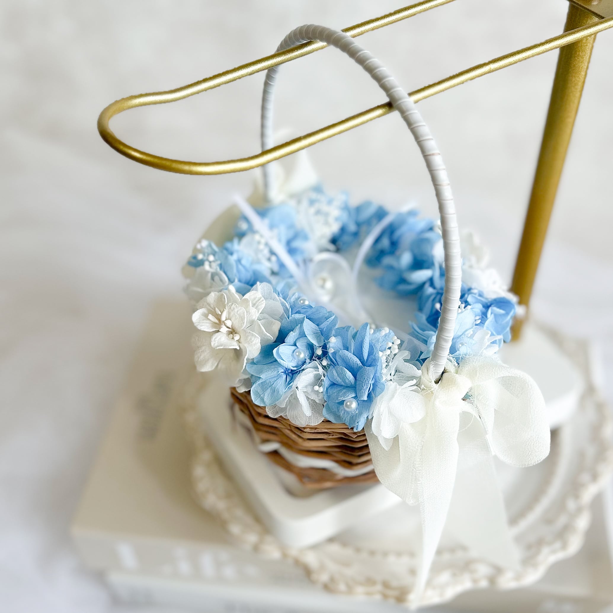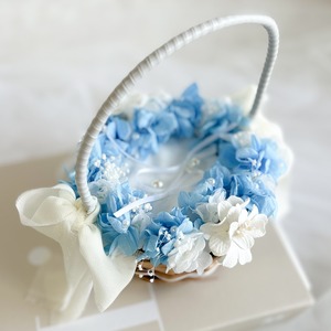 紫陽花と霞草を添えてパールをちらしたリングピローかご。