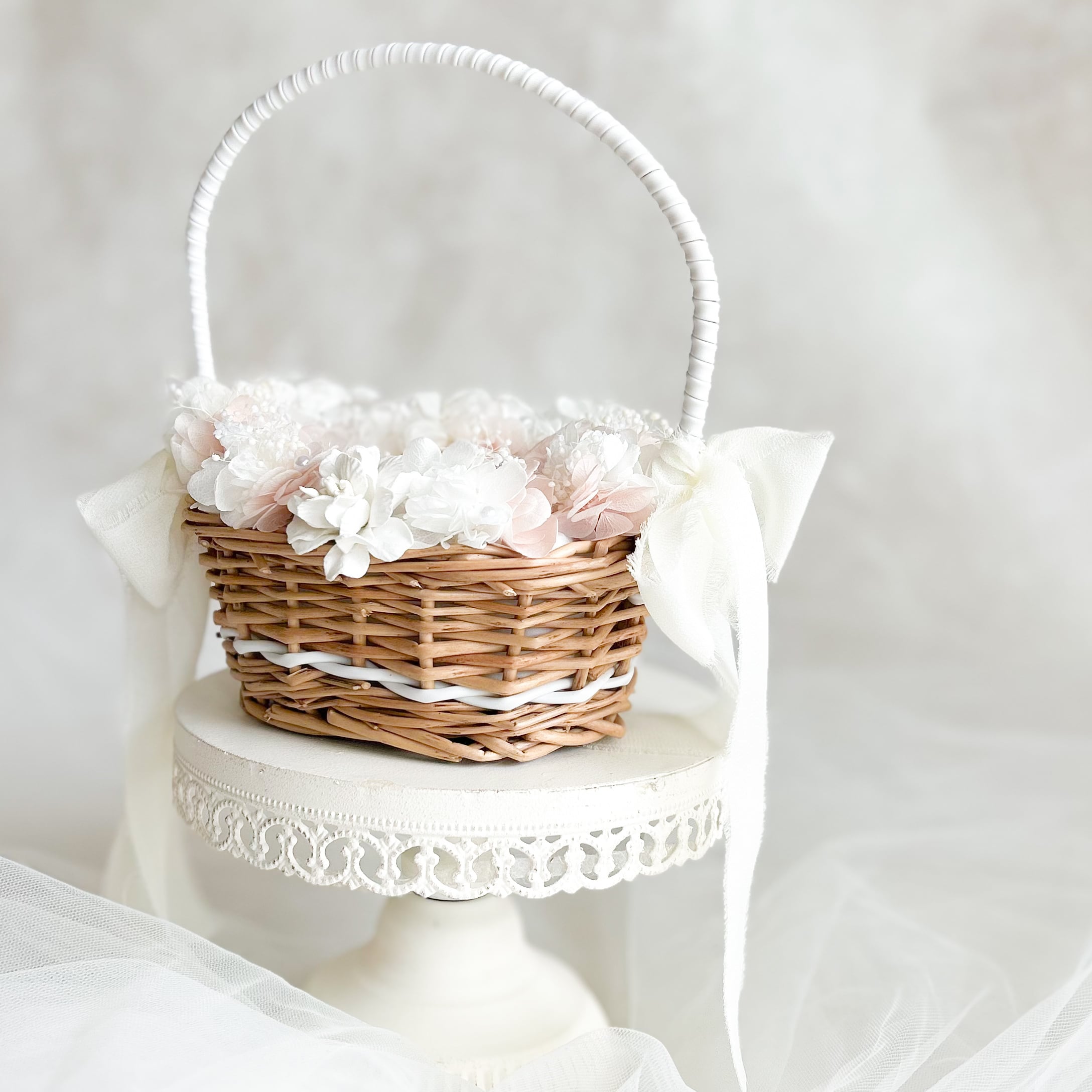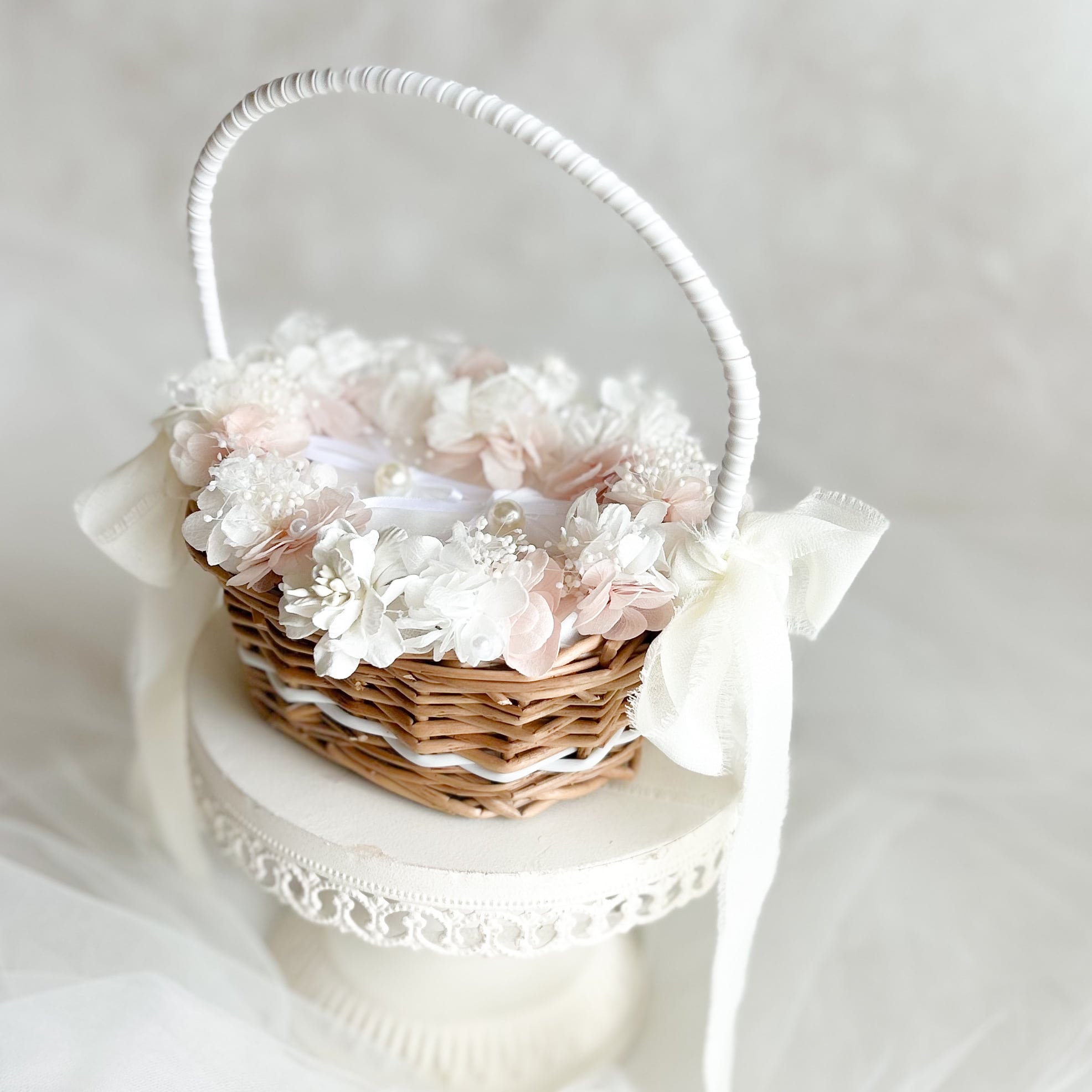 霞草を添えてパールをちらしたリングピローかご。