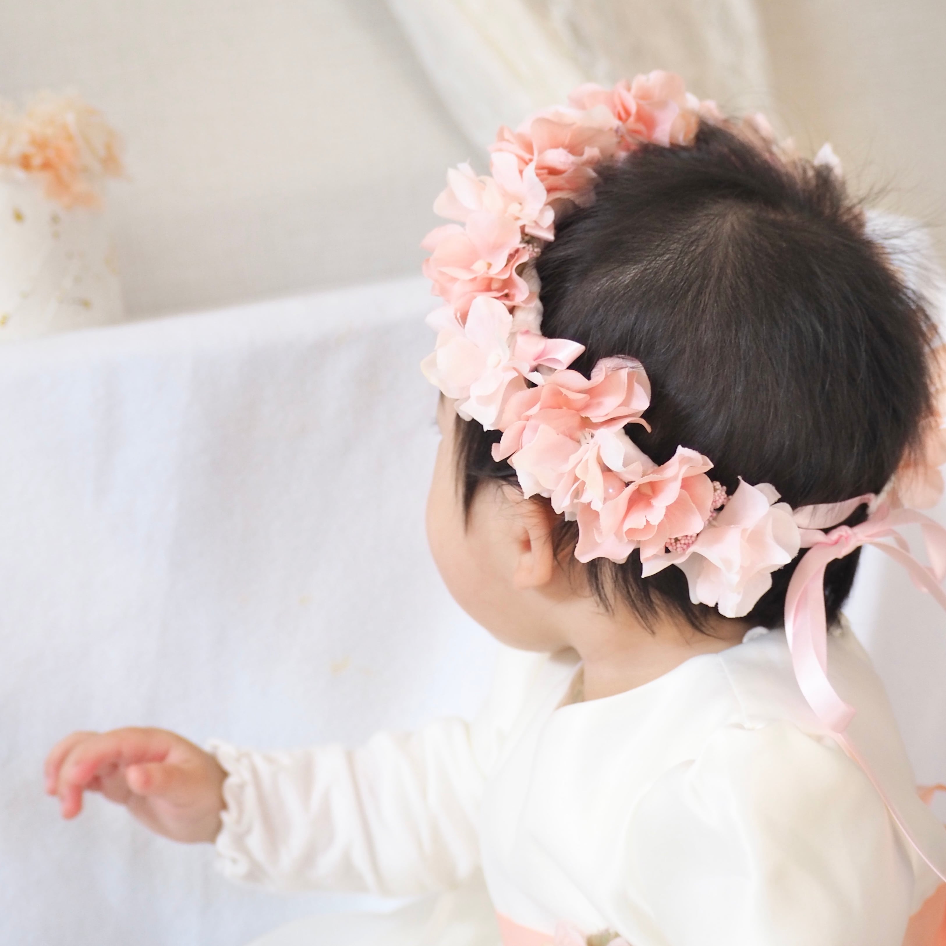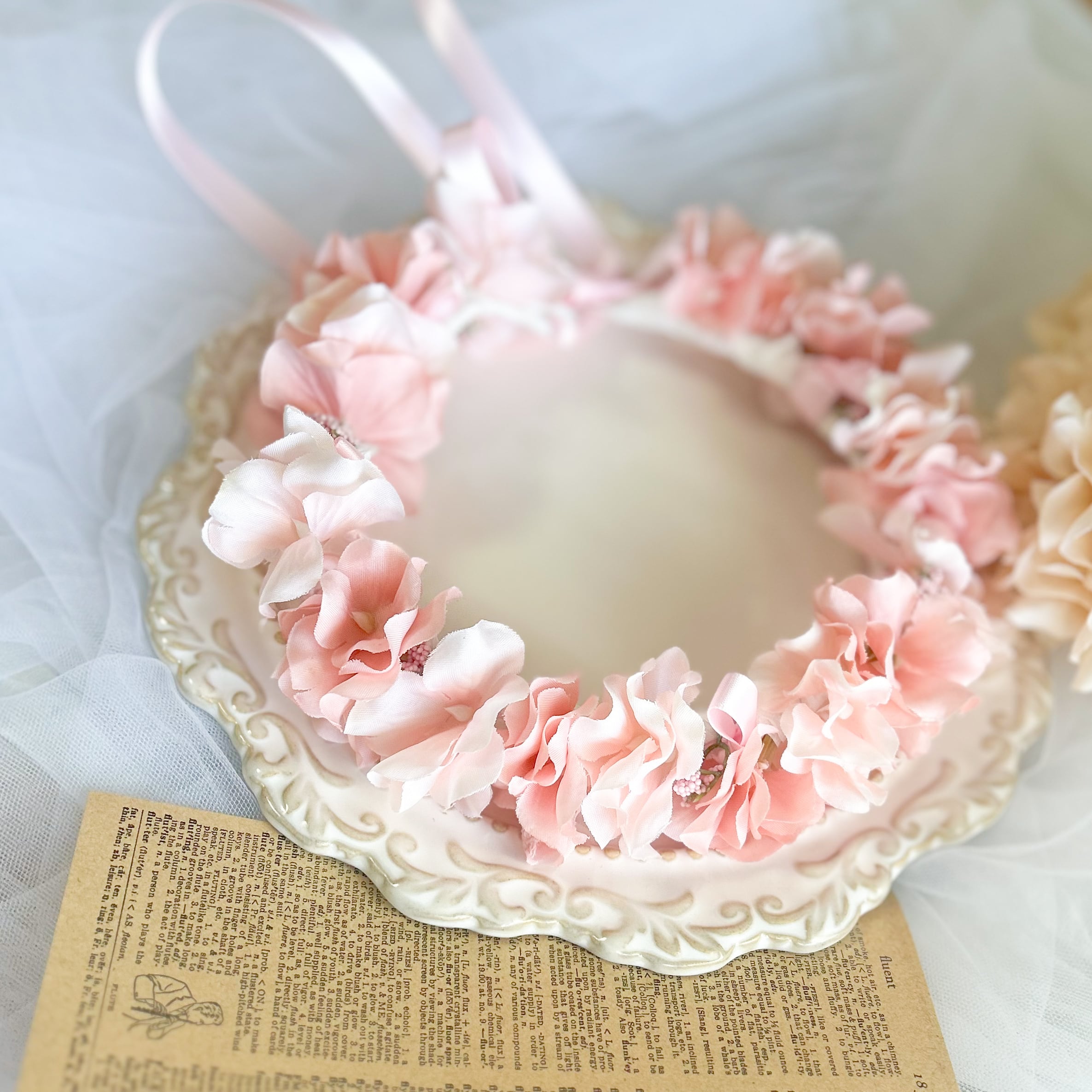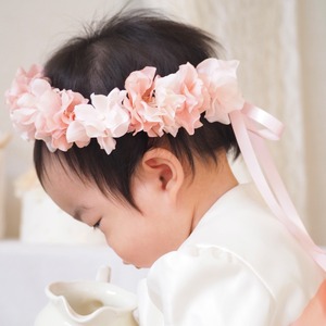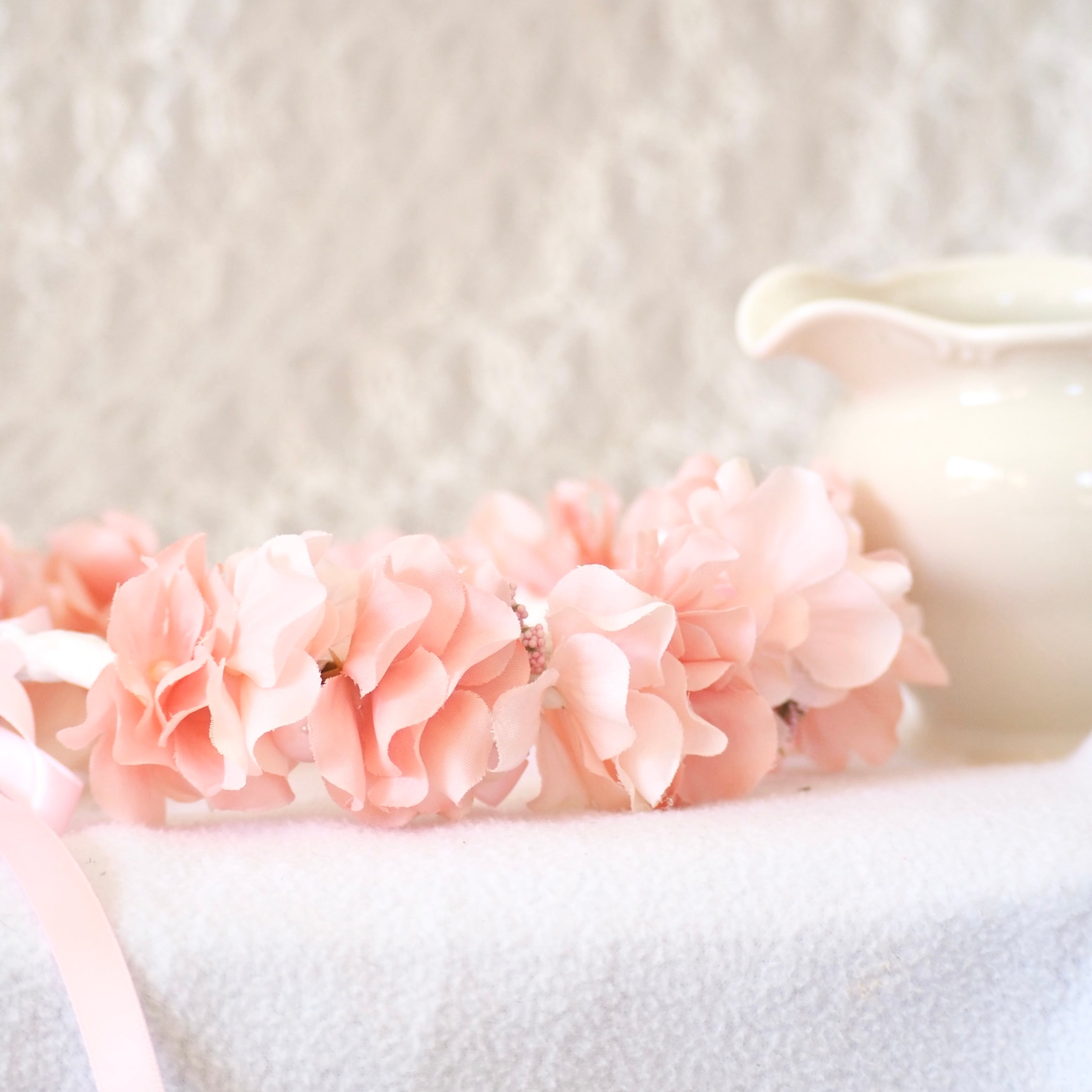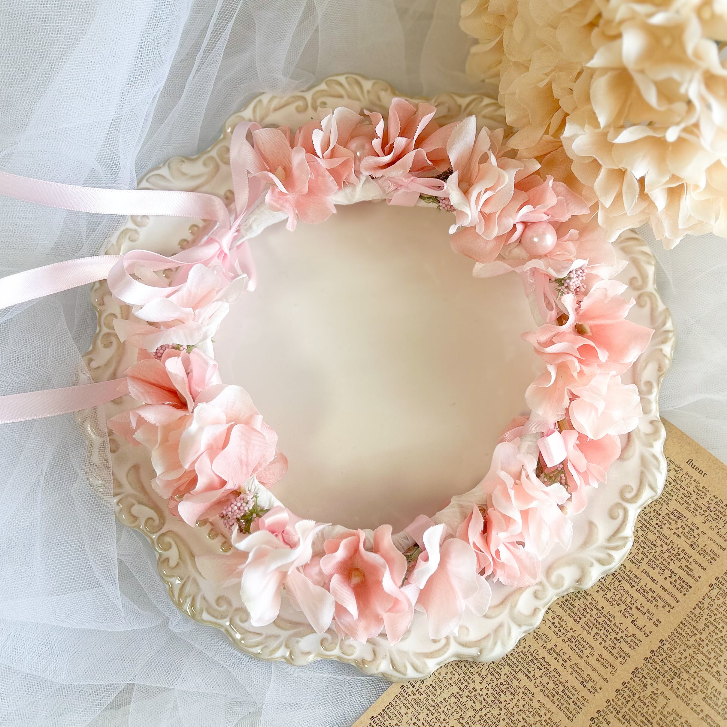 パステルピンクとコーラルピンクの紫陽花とかすみ草をたっぷりと使ってふんわりした花冠に仕上げました。