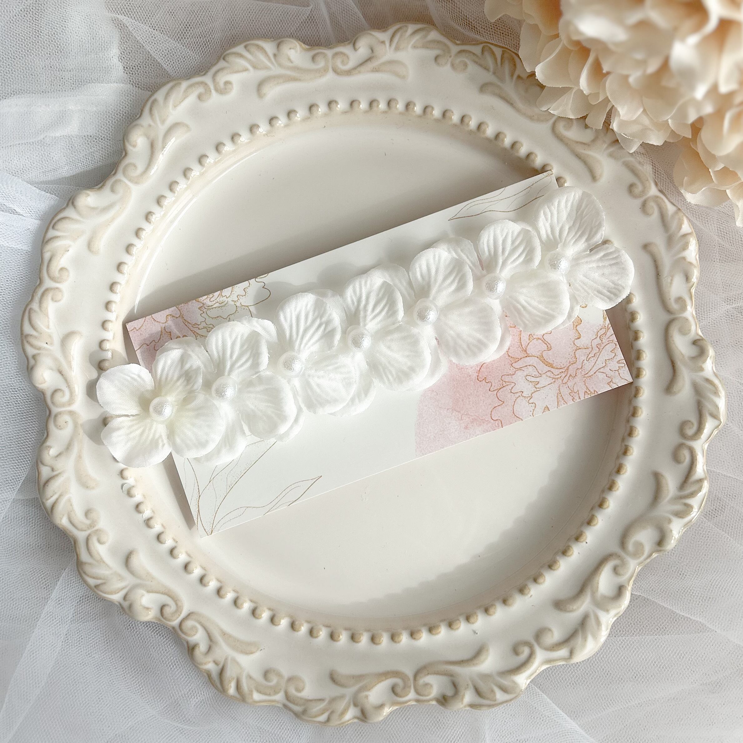 質の良いアーティフィシャルフラワー【造花】の花びらを重ねたうえにパールをのせました。